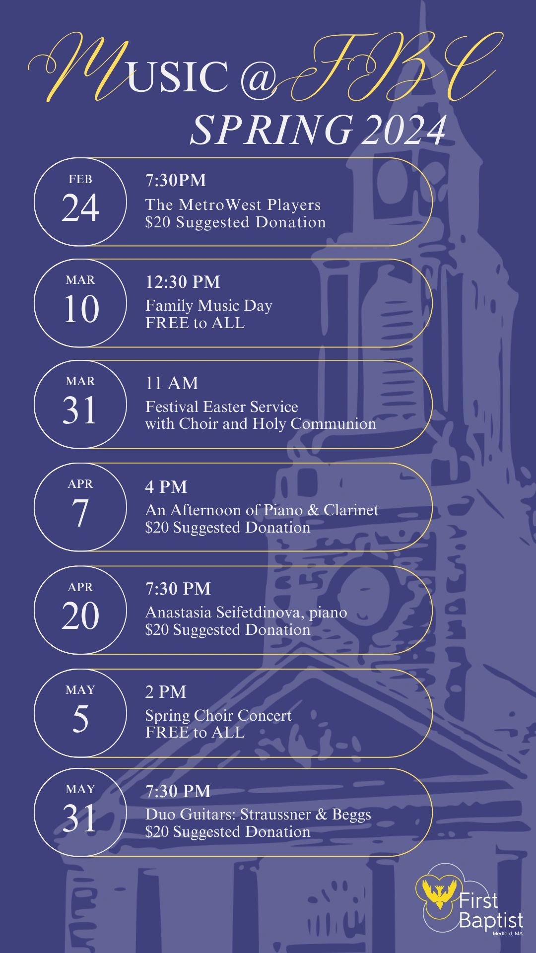 Reach out to Director of Music, Dr. Holly Zagaria, to discuss performance space and/or inclusion in future Concerts @FBC Series. You can reach Dr. Zagaria via office@firstbaptistchurchmedford.org.